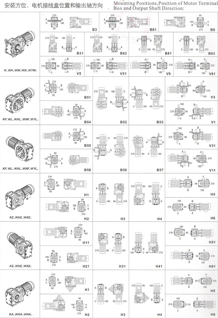 大功率直角減速機(jī)安裝方位,電機(jī)接線(xiàn)盒位置和軸輸出方向一覽表