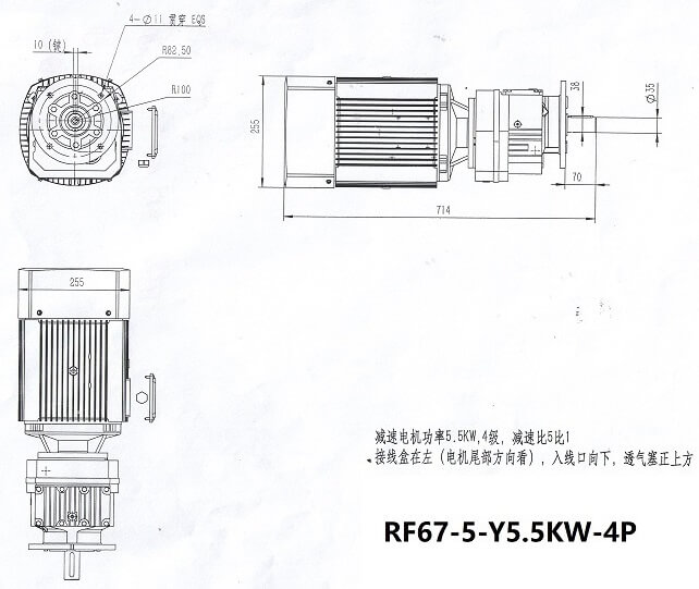 RF67-5-Y5.5KW-4P立式法蘭齒輪減速機尺寸圖減速電機功率為5.5KW 四級電機,減速比5比1,從電機尾部方向看接線盒在左邊,入線口向下,透氣塞正上方、